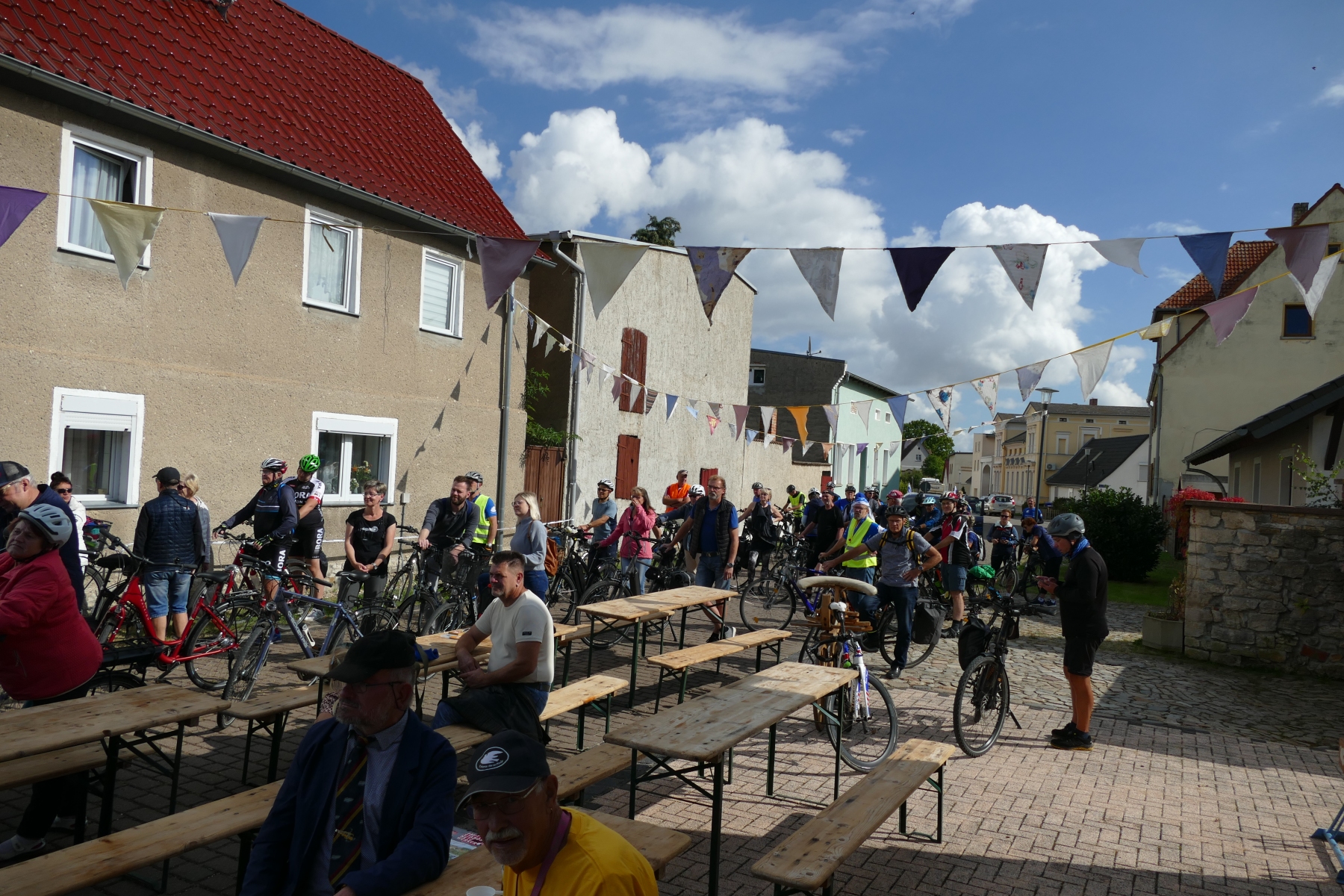 Sie war einfach nur schön und gelungen, die 1. Friedensspazierfahrt durch die Gemeinde Bördeland. Bei strahlendem Sonnenschein trafen sich am vergangenen Sonntag, über 70 Teilnehmer vor dem Radsportmuseum „Course de la Paix“ in Kleinmühlingen. Nach einem kleinen Frühstück ging es dann auf die 25 Kilometer lange Strecke durch die Gemeinde Bördeland. Wie es schon immer Tradition bei der großen Friedensfahrt war, stiegen auch am Start in Kleinmühlingen, Friedenstauben in den Himmel und die Fanfare der ehemaligen Radfernfahrt erklang zur Freude der vielen Gäste. Umwerfend war die Teilnahme der Radsportler aus allen Himmelsrichtungen des Landes. Bördeland, Welsleben , Calbe /Saale, Bernburg waren die näheren Heimatorte der Teilnehmer, aber auch aus Leipzig, Zwenkau ,Bad Doberan und Dresden, waren Sportfreunde angereist um an dieser Tour teilzunehmen. Abseits der großen Straßen ging es dann auf gut ausgebauten Landschaftswegen durch die Börde vorbei an Erntefeldern und die kleinen Gemeinden des Bördelandes. Hatte der sehr rührige Tour-Leiter Uwe Schlegel aus Bernburg anderthalb  Stunden für den Rundkurs veranschlagt, so trafen schon nach einer Stunde und vierundzwanzig Minuten das ganze Fahrerfeld wieder in Kleinmühlingen vor dem Radsportmuseum ein. Dort warteten schon Bockwurst, Kuchen und diverse Getränke auf die „erschöpften“ Radfahrer. Der selbstgebackene Kuchen von Frau Gudrun Schäfer vom Friedensfahrtmuseum ging weg wie die berühmten warmen Semmeln und die wunderschöne Radsportveranstaltung endete dann am frühen Nachmittag. Es sei noch bemerkt, das allen Organisatoren ein herzliches Danke ausgesprochen werden muss, die mit viel Herzblut und Hingabe diese Veranstaltung vorbereitet und durchgeführt haben. Ach so, niemand kam zu Fall und Pannen gab es auch nicht.