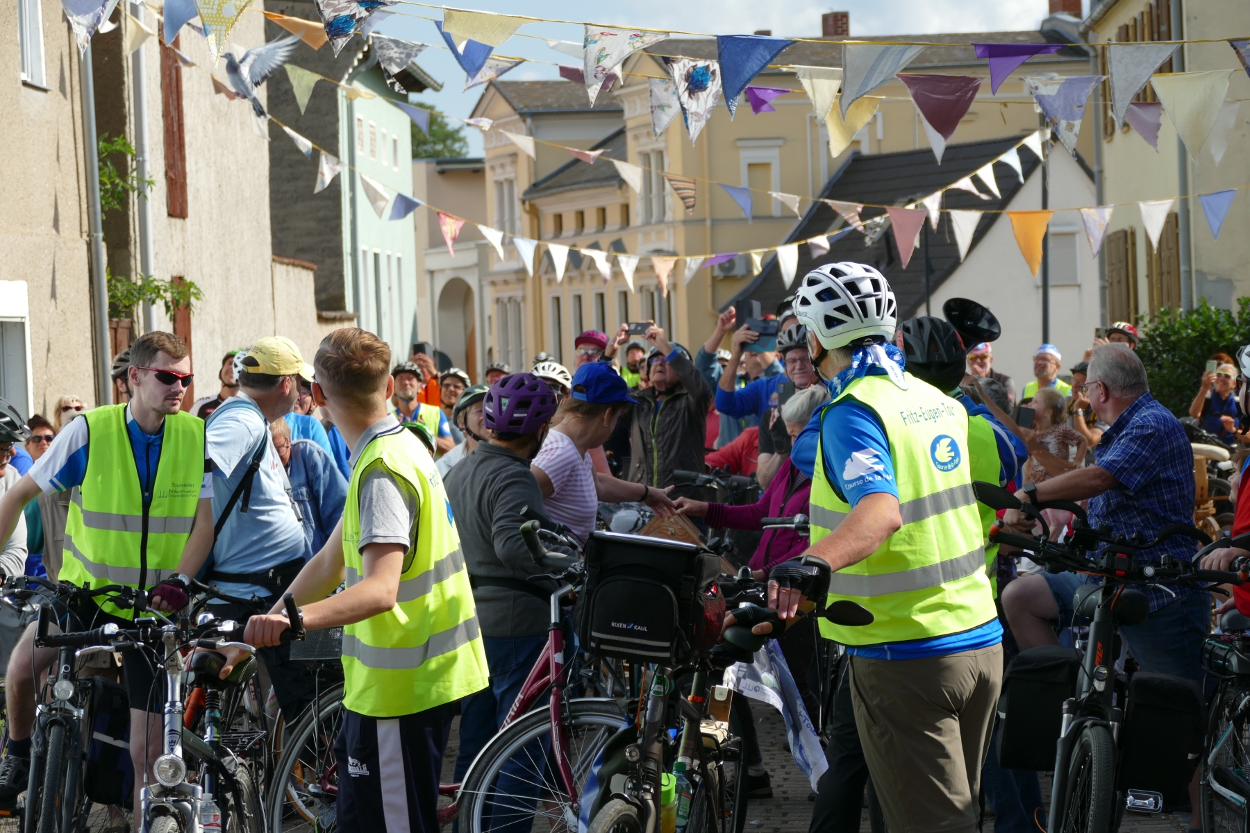 Sie war einfach nur schön und gelungen, die 1. Friedensspazierfahrt durch die Gemeinde Bördeland. Bei strahlendem Sonnenschein trafen sich am vergangenen Sonntag, über 70 Teilnehmer vor dem Radsportmuseum „Course de la Paix“ in Kleinmühlingen. Nach einem kleinen Frühstück ging es dann auf die 25 Kilometer lange Strecke durch die Gemeinde Bördeland. Wie es schon immer Tradition bei der großen Friedensfahrt war, stiegen auch am Start in Kleinmühlingen, Friedenstauben in den Himmel und die Fanfare der ehemaligen Radfernfahrt erklang zur Freude der vielen Gäste. Umwerfend war die Teilnahme der Radsportler aus allen Himmelsrichtungen des Landes. Bördeland, Welsleben , Calbe /Saale, Bernburg waren die näheren Heimatorte der Teilnehmer, aber auch aus Leipzig, Zwenkau ,Bad Doberan und Dresden, waren Sportfreunde angereist um an dieser Tour teilzunehmen. Abseits der großen Straßen ging es dann auf gut ausgebauten Landschaftswegen durch die Börde vorbei an Erntefeldern und die kleinen Gemeinden des Bördelandes. Hatte der sehr rührige Tour-Leiter Uwe Schlegel aus Bernburg anderthalb  Stunden für den Rundkurs veranschlagt, so trafen schon nach einer Stunde und vierundzwanzig Minuten das ganze Fahrerfeld wieder in Kleinmühlingen vor dem Radsportmuseum ein. Dort warteten schon Bockwurst, Kuchen und diverse Getränke auf die „erschöpften“ Radfahrer. Der selbstgebackene Kuchen von Frau Gudrun Schäfer vom Friedensfahrtmuseum ging weg wie die berühmten warmen Semmeln und die wunderschöne Radsportveranstaltung endete dann am frühen Nachmittag. Es sei noch bemerkt, das allen Organisatoren ein herzliches Danke ausgesprochen werden muss, die mit viel Herzblut und Hingabe diese Veranstaltung vorbereitet und durchgeführt haben. Ach so, niemand kam zu Fall und Pannen gab es auch nicht.
