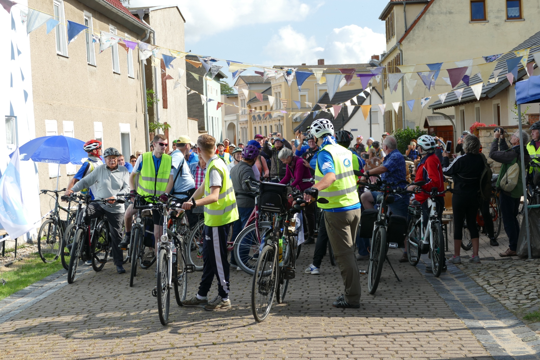 Sie war einfach nur schön und gelungen, die 1. Friedensspazierfahrt durch die Gemeinde Bördeland. Bei strahlendem Sonnenschein trafen sich am vergangenen Sonntag, über 70 Teilnehmer vor dem Radsportmuseum „Course de la Paix“ in Kleinmühlingen. Nach einem kleinen Frühstück ging es dann auf die 25 Kilometer lange Strecke durch die Gemeinde Bördeland. Wie es schon immer Tradition bei der großen Friedensfahrt war, stiegen auch am Start in Kleinmühlingen, Friedenstauben in den Himmel und die Fanfare der ehemaligen Radfernfahrt erklang zur Freude der vielen Gäste. Umwerfend war die Teilnahme der Radsportler aus allen Himmelsrichtungen des Landes. Bördeland, Welsleben , Calbe /Saale, Bernburg waren die näheren Heimatorte der Teilnehmer, aber auch aus Leipzig, Zwenkau ,Bad Doberan und Dresden, waren Sportfreunde angereist um an dieser Tour teilzunehmen. Abseits der großen Straßen ging es dann auf gut ausgebauten Landschaftswegen durch die Börde vorbei an Erntefeldern und die kleinen Gemeinden des Bördelandes. Hatte der sehr rührige Tour-Leiter Uwe Schlegel aus Bernburg anderthalb  Stunden für den Rundkurs veranschlagt, so trafen schon nach einer Stunde und vierundzwanzig Minuten das ganze Fahrerfeld wieder in Kleinmühlingen vor dem Radsportmuseum ein. Dort warteten schon Bockwurst, Kuchen und diverse Getränke auf die „erschöpften“ Radfahrer. Der selbstgebackene Kuchen von Frau Gudrun Schäfer vom Friedensfahrtmuseum ging weg wie die berühmten warmen Semmeln und die wunderschöne Radsportveranstaltung endete dann am frühen Nachmittag. Es sei noch bemerkt, das allen Organisatoren ein herzliches Danke ausgesprochen werden muss, die mit viel Herzblut und Hingabe diese Veranstaltung vorbereitet und durchgeführt haben. Ach so, niemand kam zu Fall und Pannen gab es auch nicht.
