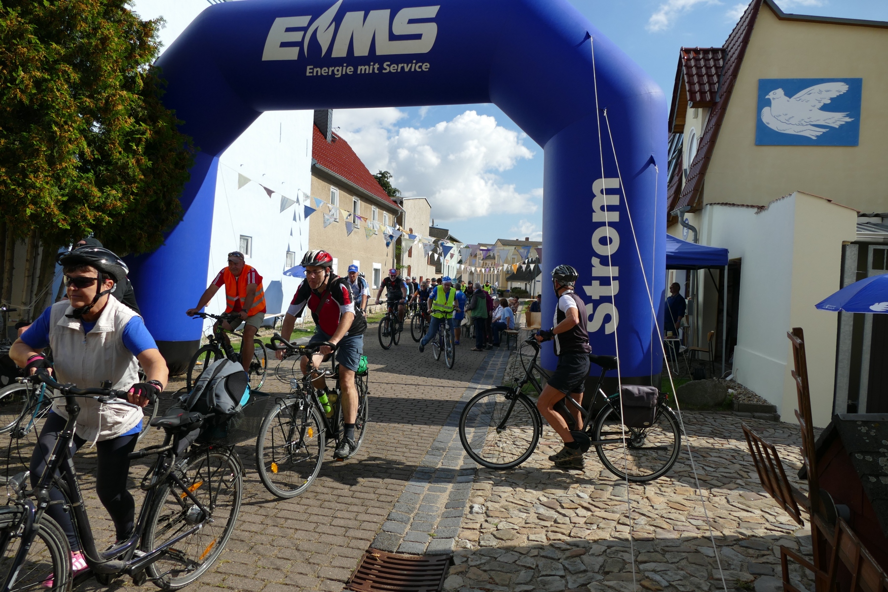 Sie war einfach nur schön und gelungen, die 1. Friedensspazierfahrt durch die Gemeinde Bördeland. Bei strahlendem Sonnenschein trafen sich am vergangenen Sonntag, über 70 Teilnehmer vor dem Radsportmuseum „Course de la Paix“ in Kleinmühlingen. Nach einem kleinen Frühstück ging es dann auf die 25 Kilometer lange Strecke durch die Gemeinde Bördeland. Wie es schon immer Tradition bei der großen Friedensfahrt war, stiegen auch am Start in Kleinmühlingen, Friedenstauben in den Himmel und die Fanfare der ehemaligen Radfernfahrt erklang zur Freude der vielen Gäste. Umwerfend war die Teilnahme der Radsportler aus allen Himmelsrichtungen des Landes. Bördeland, Welsleben , Calbe /Saale, Bernburg waren die näheren Heimatorte der Teilnehmer, aber auch aus Leipzig, Zwenkau ,Bad Doberan und Dresden, waren Sportfreunde angereist um an dieser Tour teilzunehmen. Abseits der großen Straßen ging es dann auf gut ausgebauten Landschaftswegen durch die Börde vorbei an Erntefeldern und die kleinen Gemeinden des Bördelandes. Hatte der sehr rührige Tour-Leiter Uwe Schlegel aus Bernburg anderthalb  Stunden für den Rundkurs veranschlagt, so trafen schon nach einer Stunde und vierundzwanzig Minuten das ganze Fahrerfeld wieder in Kleinmühlingen vor dem Radsportmuseum ein. Dort warteten schon Bockwurst, Kuchen und diverse Getränke auf die „erschöpften“ Radfahrer. Der selbstgebackene Kuchen von Frau Gudrun Schäfer vom Friedensfahrtmuseum ging weg wie die berühmten warmen Semmeln und die wunderschöne Radsportveranstaltung endete dann am frühen Nachmittag. Es sei noch bemerkt, das allen Organisatoren ein herzliches Danke ausgesprochen werden muss, die mit viel Herzblut und Hingabe diese Veranstaltung vorbereitet und durchgeführt haben. Ach so, niemand kam zu Fall und Pannen gab es auch nicht.