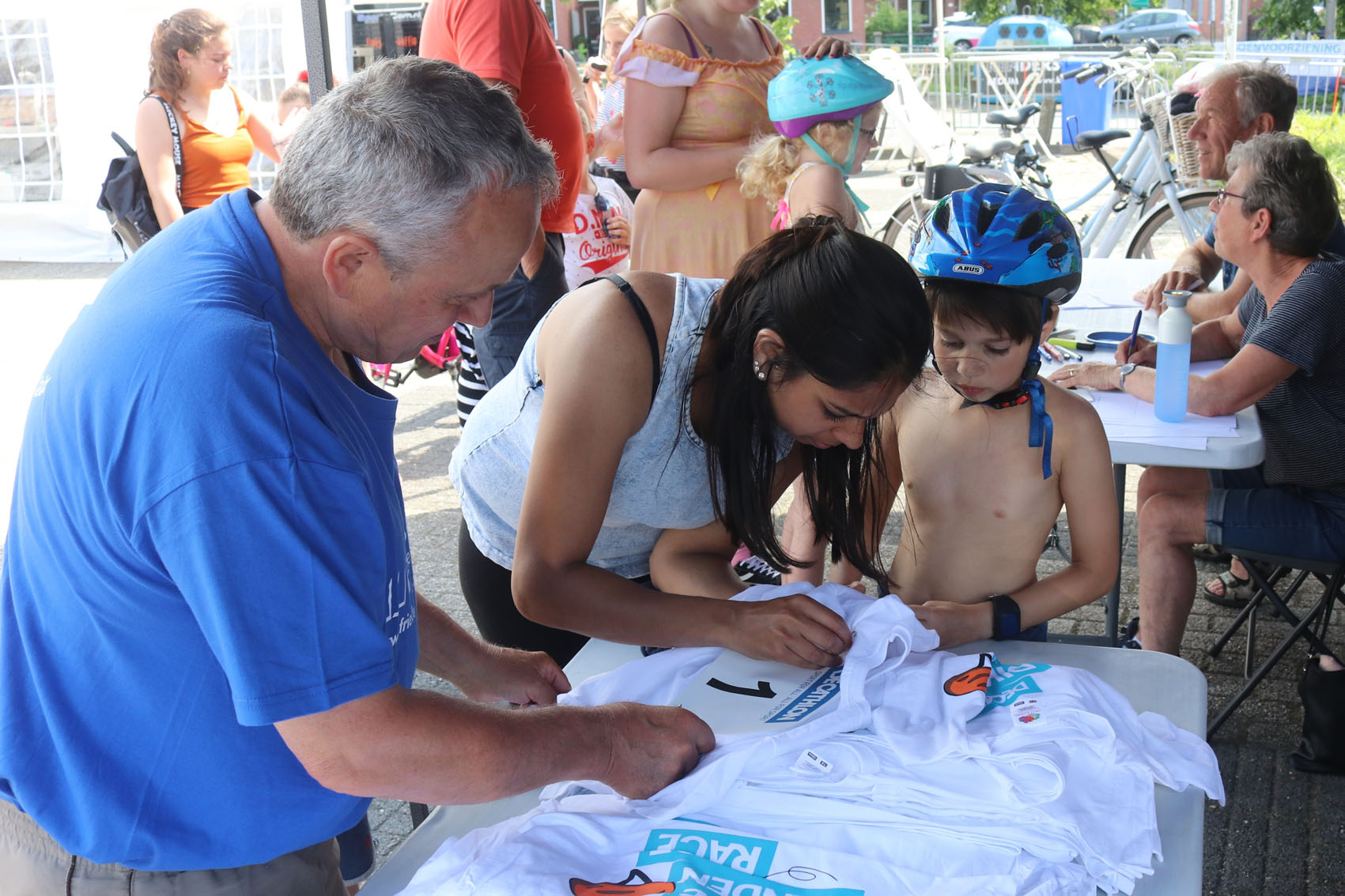 90 Kinder aus Grundschulen der Region gingen in drei Altersgruppen jeweils für Mädchen und Jungen diesmal beim „Decathlon-Dikke Banden Race“ an den Start. Das war ein Rekord-Teilnehmerfeld, denn selbst die Männer-Elite brachte es nur auf 84 Teilnehmer. Wo gibt es Vergleichbares? Auch dass die Kleinen unter Aufsicht einer Jury der Königlichen Niederländischen Radsportunion ihre Rennen austrugen ist wohl einmalig. Am Ende gab es für jeden der sechs Sieger ein Gelbes Trikot – überreicht vom Museumschef Horst Schäfer aus Kleinmühlingen.