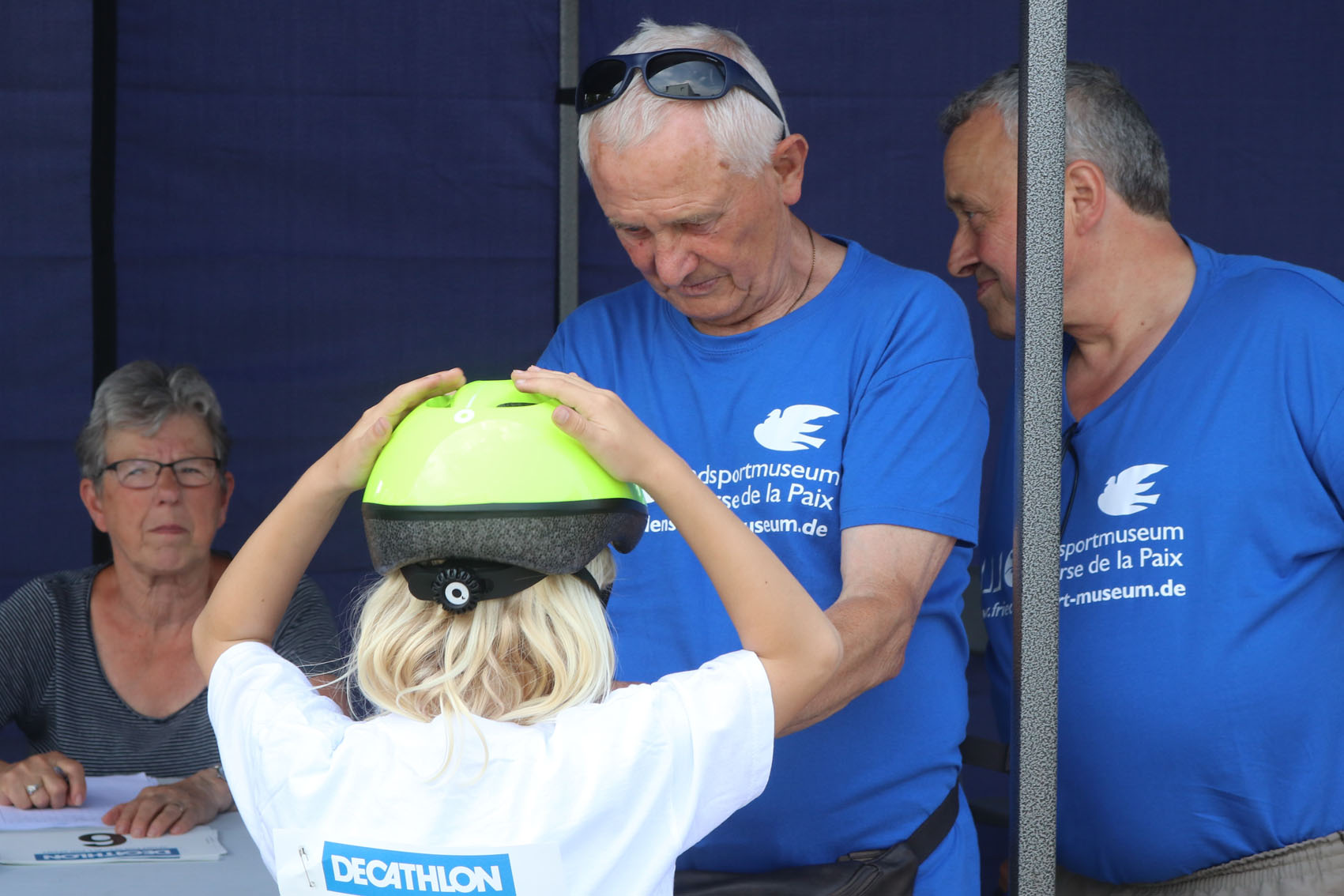 90 Kinder aus Grundschulen der Region gingen in drei Altersgruppen jeweils für Mädchen und Jungen diesmal beim „Decathlon-Dikke Banden Race“ an den Start. Das war ein Rekord-Teilnehmerfeld, denn selbst die Männer-Elite brachte es nur auf 84 Teilnehmer. Wo gibt es Vergleichbares? Auch dass die Kleinen unter Aufsicht einer Jury der Königlichen Niederländischen Radsportunion ihre Rennen austrugen ist wohl einmalig. Am Ende gab es für jeden der sechs Sieger ein Gelbes Trikot – überreicht vom Museumschef Horst Schäfer aus Kleinmühlingen.