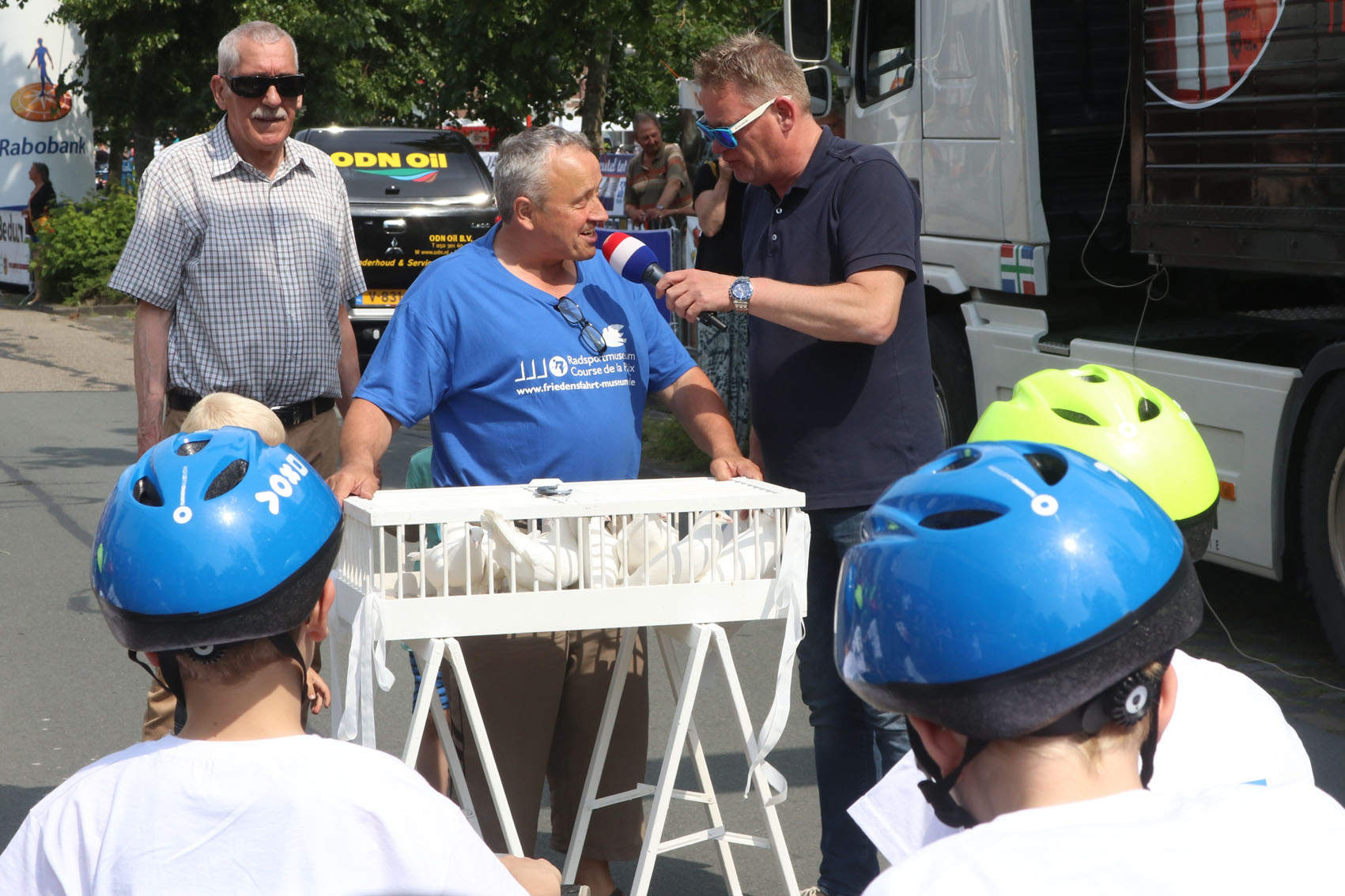 90 Kinder aus Grundschulen der Region gingen in drei Altersgruppen jeweils für Mädchen und Jungen diesmal beim „Decathlon-Dikke Banden Race“ an den Start. Das war ein Rekord-Teilnehmerfeld, denn selbst die Männer-Elite brachte es nur auf 84 Teilnehmer. Wo gibt es Vergleichbares? Auch dass die Kleinen unter Aufsicht einer Jury der Königlichen Niederländischen Radsportunion ihre Rennen austrugen ist wohl einmalig. Am Ende gab es für jeden der sechs Sieger ein Gelbes Trikot – überreicht vom Museumschef Horst Schäfer aus Kleinmühlingen.