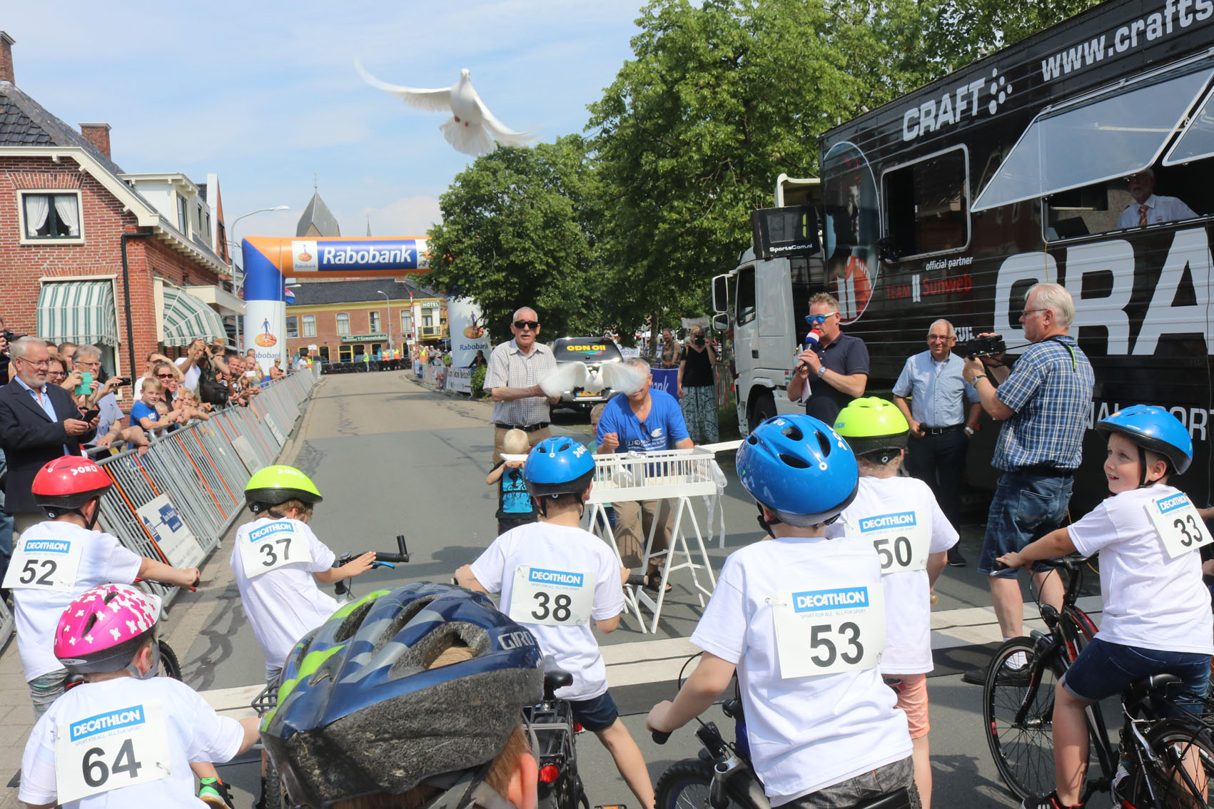 90 Kinder aus Grundschulen der Region gingen in drei Altersgruppen jeweils für Mädchen und Jungen diesmal beim „Decathlon-Dikke Banden Race“ an den Start. Das war ein Rekord-Teilnehmerfeld, denn selbst die Männer-Elite brachte es nur auf 84 Teilnehmer. Wo gibt es Vergleichbares? Auch dass die Kleinen unter Aufsicht einer Jury der Königlichen Niederländischen Radsportunion ihre Rennen austrugen ist wohl einmalig. Am Ende gab es für jeden der sechs Sieger ein Gelbes Trikot – überreicht vom Museumschef Horst Schäfer aus Kleinmühlingen.