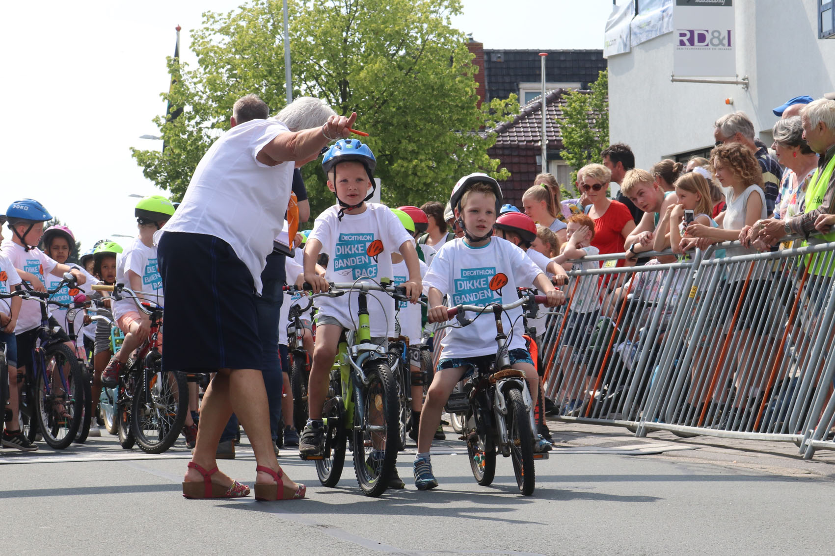 90 Kinder aus Grundschulen der Region gingen in drei Altersgruppen jeweils für Mädchen und Jungen diesmal beim „Decathlon-Dikke Banden Race“ an den Start. Das war ein Rekord-Teilnehmerfeld, denn selbst die Männer-Elite brachte es nur auf 84 Teilnehmer. Wo gibt es Vergleichbares? Auch dass die Kleinen unter Aufsicht einer Jury der Königlichen Niederländischen Radsportunion ihre Rennen austrugen ist wohl einmalig. Am Ende gab es für jeden der sechs Sieger ein Gelbes Trikot – überreicht vom Museumschef Horst Schäfer aus Kleinmühlingen.