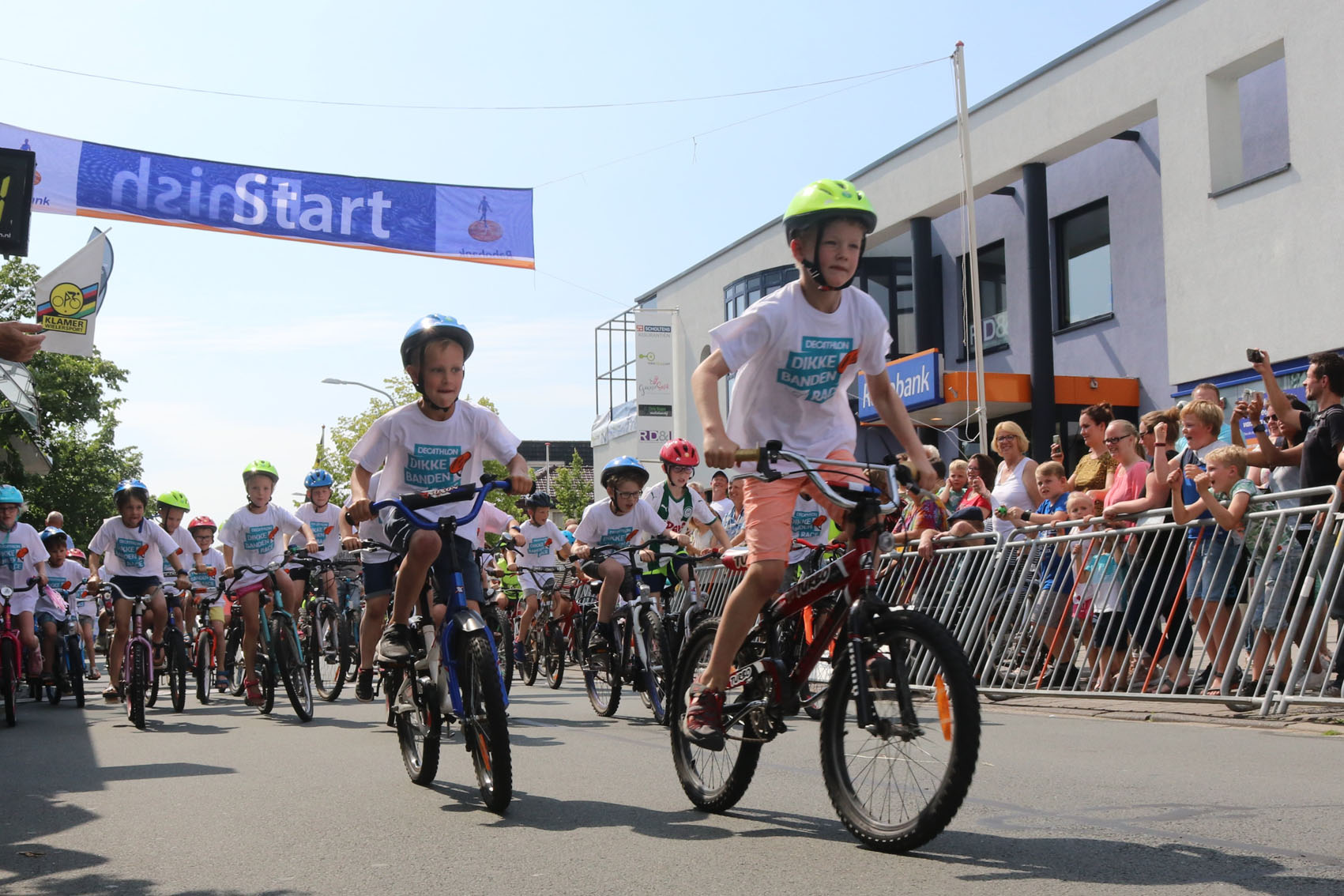 90 Kinder aus Grundschulen der Region gingen in drei Altersgruppen jeweils für Mädchen und Jungen diesmal beim „Decathlon-Dikke Banden Race“ an den Start. Das war ein Rekord-Teilnehmerfeld, denn selbst die Männer-Elite brachte es nur auf 84 Teilnehmer. Wo gibt es Vergleichbares? Auch dass die Kleinen unter Aufsicht einer Jury der Königlichen Niederländischen Radsportunion ihre Rennen austrugen ist wohl einmalig. Am Ende gab es für jeden der sechs Sieger ein Gelbes Trikot – überreicht vom Museumschef Horst Schäfer aus Kleinmühlingen.
