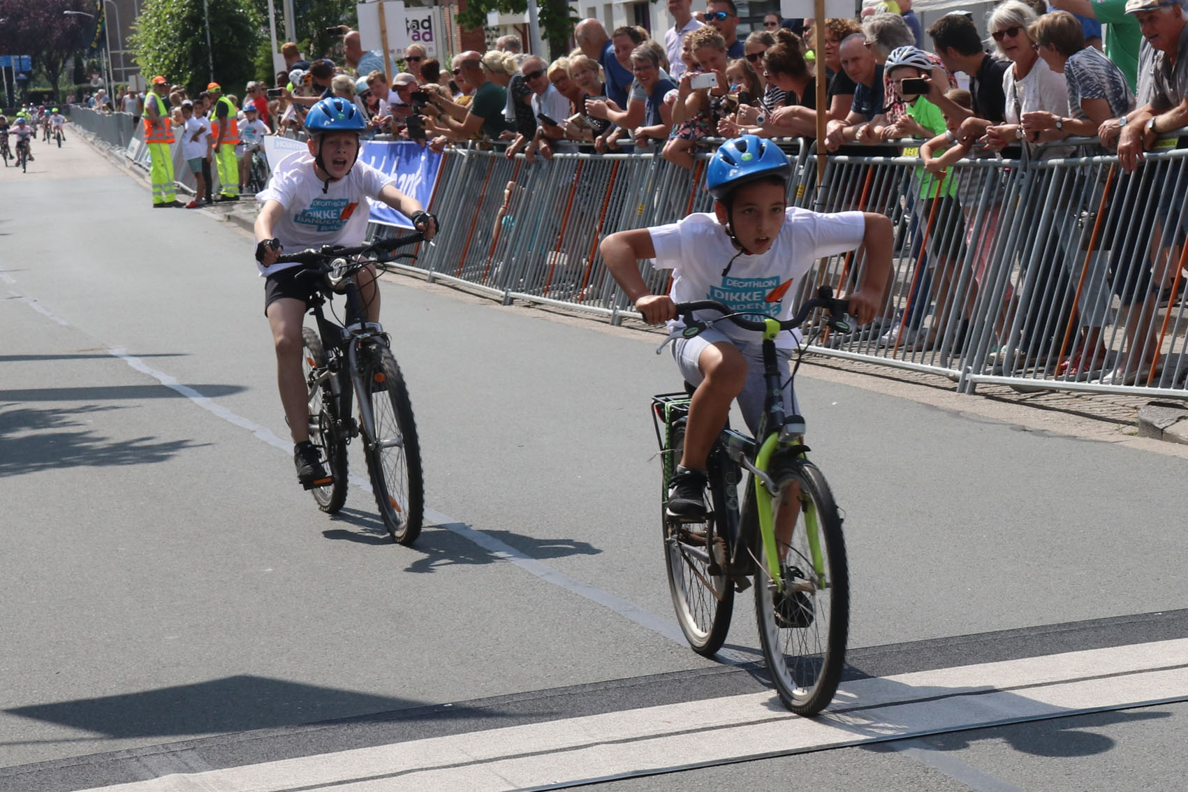 90 Kinder aus Grundschulen der Region gingen in drei Altersgruppen jeweils für Mädchen und Jungen diesmal beim „Decathlon-Dikke Banden Race“ an den Start. Das war ein Rekord-Teilnehmerfeld, denn selbst die Männer-Elite brachte es nur auf 84 Teilnehmer. Wo gibt es Vergleichbares? Auch dass die Kleinen unter Aufsicht einer Jury der Königlichen Niederländischen Radsportunion ihre Rennen austrugen ist wohl einmalig. Am Ende gab es für jeden der sechs Sieger ein Gelbes Trikot – überreicht vom Museumschef Horst Schäfer aus Kleinmühlingen.
