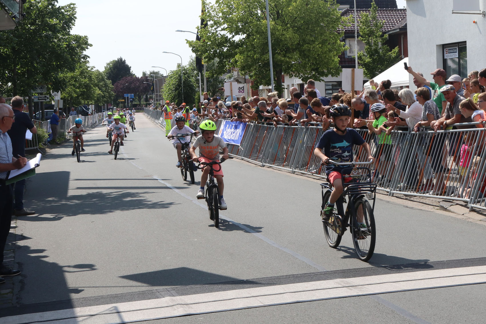 90 Kinder aus Grundschulen der Region gingen in drei Altersgruppen jeweils für Mädchen und Jungen diesmal beim „Decathlon-Dikke Banden Race“ an den Start. Das war ein Rekord-Teilnehmerfeld, denn selbst die Männer-Elite brachte es nur auf 84 Teilnehmer. Wo gibt es Vergleichbares? Auch dass die Kleinen unter Aufsicht einer Jury der Königlichen Niederländischen Radsportunion ihre Rennen austrugen ist wohl einmalig. Am Ende gab es für jeden der sechs Sieger ein Gelbes Trikot – überreicht vom Museumschef Horst Schäfer aus Kleinmühlingen.