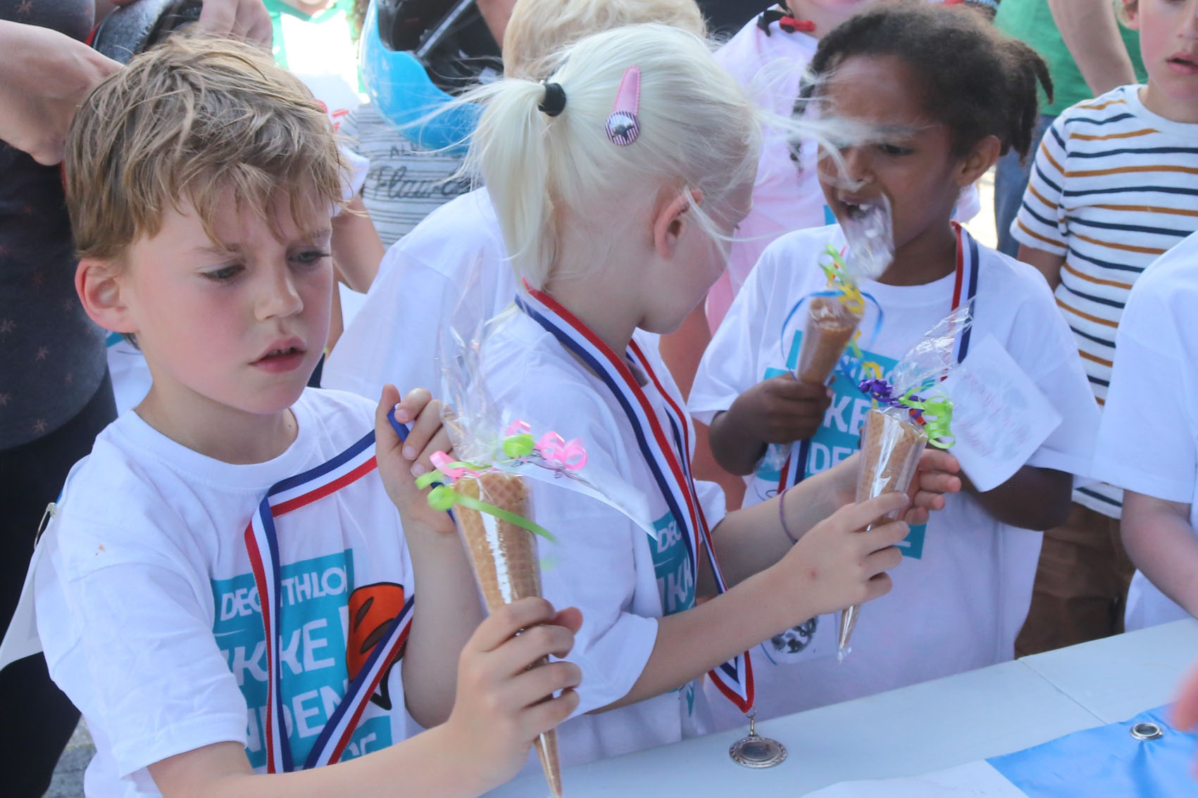90 Kinder aus Grundschulen der Region gingen in drei Altersgruppen jeweils für Mädchen und Jungen diesmal beim „Decathlon-Dikke Banden Race“ an den Start. Das war ein Rekord-Teilnehmerfeld, denn selbst die Männer-Elite brachte es nur auf 84 Teilnehmer. Wo gibt es Vergleichbares? Auch dass die Kleinen unter Aufsicht einer Jury der Königlichen Niederländischen Radsportunion ihre Rennen austrugen ist wohl einmalig. Am Ende gab es für jeden der sechs Sieger ein Gelbes Trikot – überreicht vom Museumschef Horst Schäfer aus Kleinmühlingen.