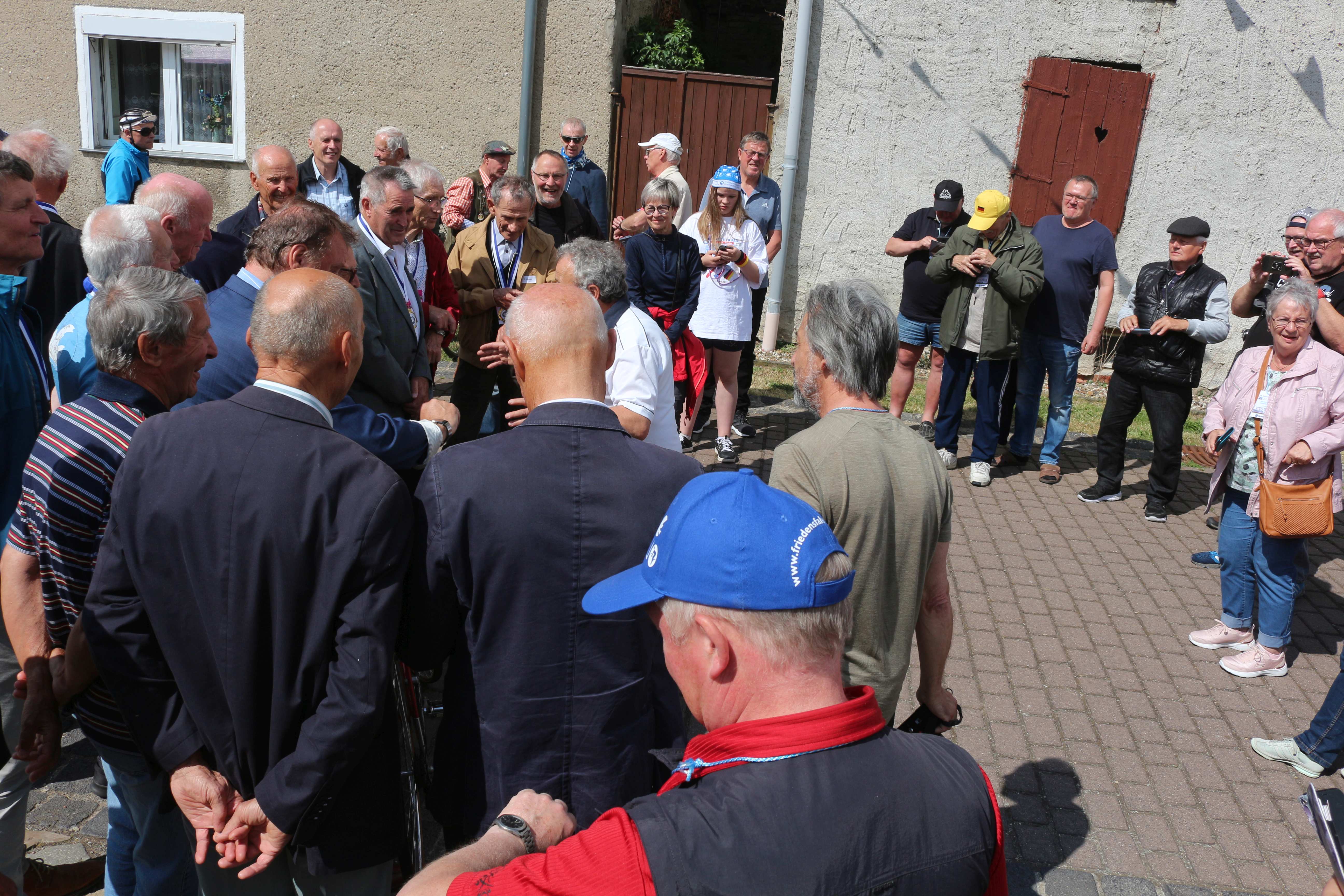 Es war ein wunderschöner Tag im kleinen Bördedorf Kleinmühlingen, der „Vatertag“ am Donnerstag, dem 26.Mai 2022. Mit viel Liebe und einer immensen Vorarbeit, hatte der Verein vom Radsportmuseum „Course de la Paix“ ein Fest auf die Beine gestellt, dass hunderte Besucher angelockt hat. Alle geladenen ehemaligen Friedensfahrer, Trainer und Betreuer waren der Einladung gefolgt und trugen maßgeblich dazu bei, dass der Tag auch ein voller Erfolg wurde. Doch der Tag begann für die geladene Gäste zunächst in Schönebeck. Nach gutem Frühstück im Hotel wurde ein kleiner Spaziergang in den Kurpark unternommen. Eine sehr nette Mitarbeiterin der Kurparkinformation übernahm es dann, den Gästen das Solebad und seine technischen Einrichtungen rund um das Salz zu erklären. Höhepunkt war die „Besteigung“ des Gradierwerkes und aus luftiger Höhe hatte man einen herrlichen Rundblick über Bad Salzelmen und Umgebung. Sehr lobend äußerte man sich über die gepflegten Anlagen und Einrichtungen des Kurparkes. Die Fahrt ging dann anschließen per Bus nach Kleinmühlingen, wo schon viele Besucher auf ihre „Radsportstars“ voller Ungeduld warteten. Und um das Museum ein wahres Volksfest. Niemand musste dursten und hungern und ganz besonderen Anklang fanden die selbsgebackenen Kuchen der fleißigen Frauen vom Gymnastik- und Kirchbauverein. Wie in alten Zeiten, wurden dann die ehemaligen „Ritter der Pedalen“ durch den Moderator Reiner Rechenberger, dem Publikum vorgestellt. Jeder erhielt seine Erinnerungsmedaille und als kleines Präsent eine Salzlandkiste mit Produkten der Region. Doch auch die Gäste hatten Geschenke im Gepäck und wurden an Horst Schäfer für das Museum überreicht. Ortwin Czarnowski, ehemaliges Mitglied der Friedensfahrtmannschaft der Bundesrepublik 1967, überreichte neben gutem Wein aus der Hanauer Region, einen jungen Kirschbaum und einen Eichensetzling, die nun im Garten von Schäfers wachsen und gedeihen sollen. Die nächsten Stunden nach der Vorstellung waren dann angefüllt mit vielen Gesprächen und Diskussionen rund um den Radsport und auch die Autogrammjäger kamen nicht zu kurz. Besonders Peter Becker, der ehemalige Trainer von Jan Ullrich musste viele Fragen beantworten und konnte einige Geschichten aus seiner Zeit mit Ullrich erzählen. Ja, „Ulle“ war schon ein Jahrhunderttalent und durch seine großen sportlichen Erfolge, für einen Trainer immer ein Beweis, dass junge Menschen durch Sport formbar sind und Höchstleistungen erreichen können. Aber Becker sagte auch zu einigen Fragen nur sehr diplomatisch, dass jeder Mensch seines Glückes Schmied ist. Irgendwie zutreffend auf seinen ehemaligen Schützling. Als der Tag vor dem Radsportmuseum langsam sich dem Ende neigte, stiegen wie bei jedem Treffen, die weißen Tauben, das Symbol der Friedensfahrt, in den abendlichen Himmel über Kleinmühlingen und trugen ein Botschaft mit sich fort. Möge der Frieden wieder einkehren und erhalten bleiben. Nach langer Wartezeit war es für die Mannschaft um Horst Schäfer und dem Museum jedenfalls eine sehr gelungene Veranstaltung und die vielen Besucher und Gästen fanden viele lobende