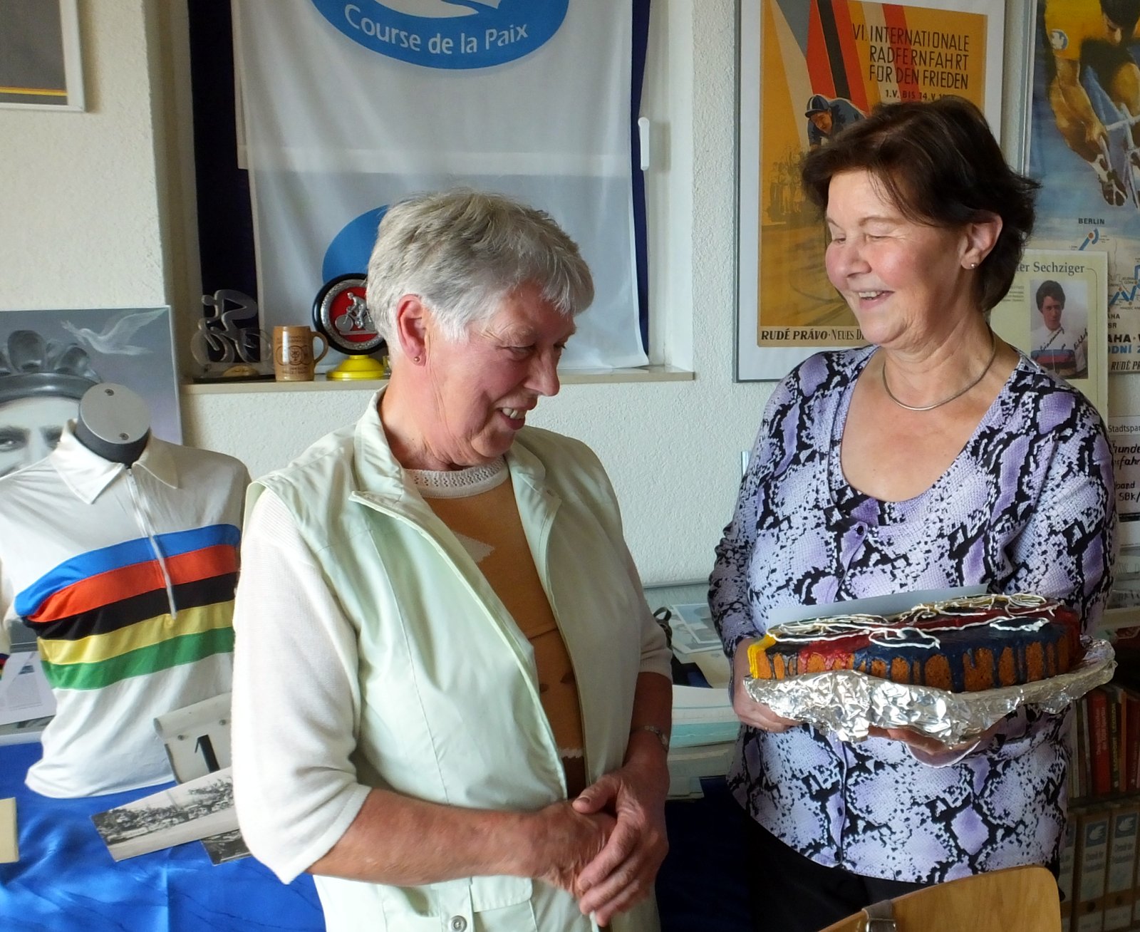 Gudrun Schäfer übereicht im Namen des Radsportmuseums einen "Fahrradkuchen" in den Farben des Regenbogentrikots