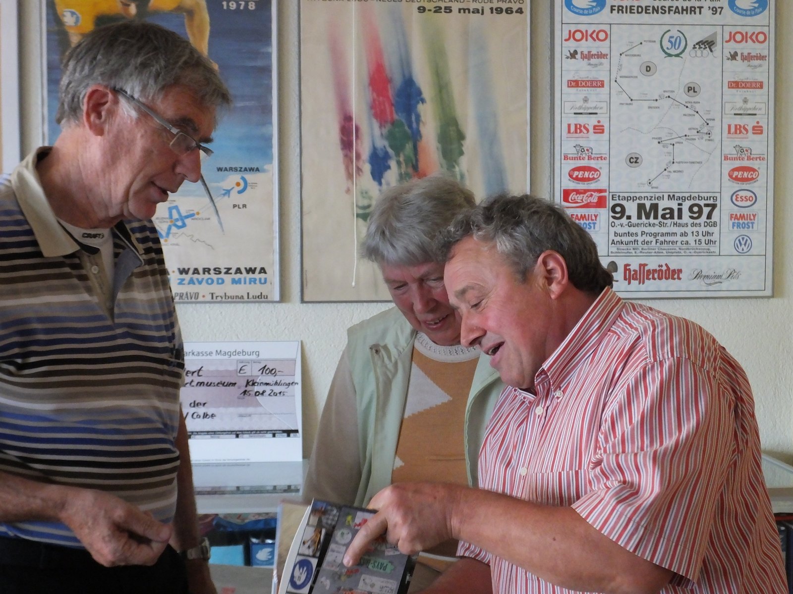 Info zur Massagebank: Be Huizing war viele, viele Jahre Physiotherapeut der niederländischen Radrennfahrer und massierte die Sportler auf einer Massagebank. Jetzt hat er sich zur Ruhe gesetzt und benötigt die Massagebank nicht mehr. Da er genau Buch geführt hat, kann er eidesstattlich versichern (alles in einem vorliegendem Fotobuch festgehalten), dass bis zum 5. September 2015, neunundvierzig (49) Weltmeister auf dieser Massagebank lagen. Nachdem Elisabeth Eichholz nun am 5. September 2015 als 50. Weltmeisterin auf der Massagebank saß, übergab Be Huizing diese Massagebank dem Radsportmuseum. Das Kapitel der Massagebank ist damit abgeschlossen und sie kann ab sofort, mit beiliegendem Fotobuch im Museum betrachtet werden. Die Bilder der 50 Weltmeister-innen werden jetzt digital aufbereitet und laufen dann als Endlosschleife in einem digitalen Bilderrahmen… und hier möchten wir wieder an den Gedanken und Anliegen der Friedensfahrt erinnern, dass Sport Völker verbindet. Denn bestimmt gibt es auch in den Niederlanden die Möglichkeit, die Massagebank und ihre Geschichte zu zeigen …. – aber nein sie steht jetzt im Friedensfahrt Museum. Im Übrigen erhielt Be Huizing diese Massagebank aus Norwegen