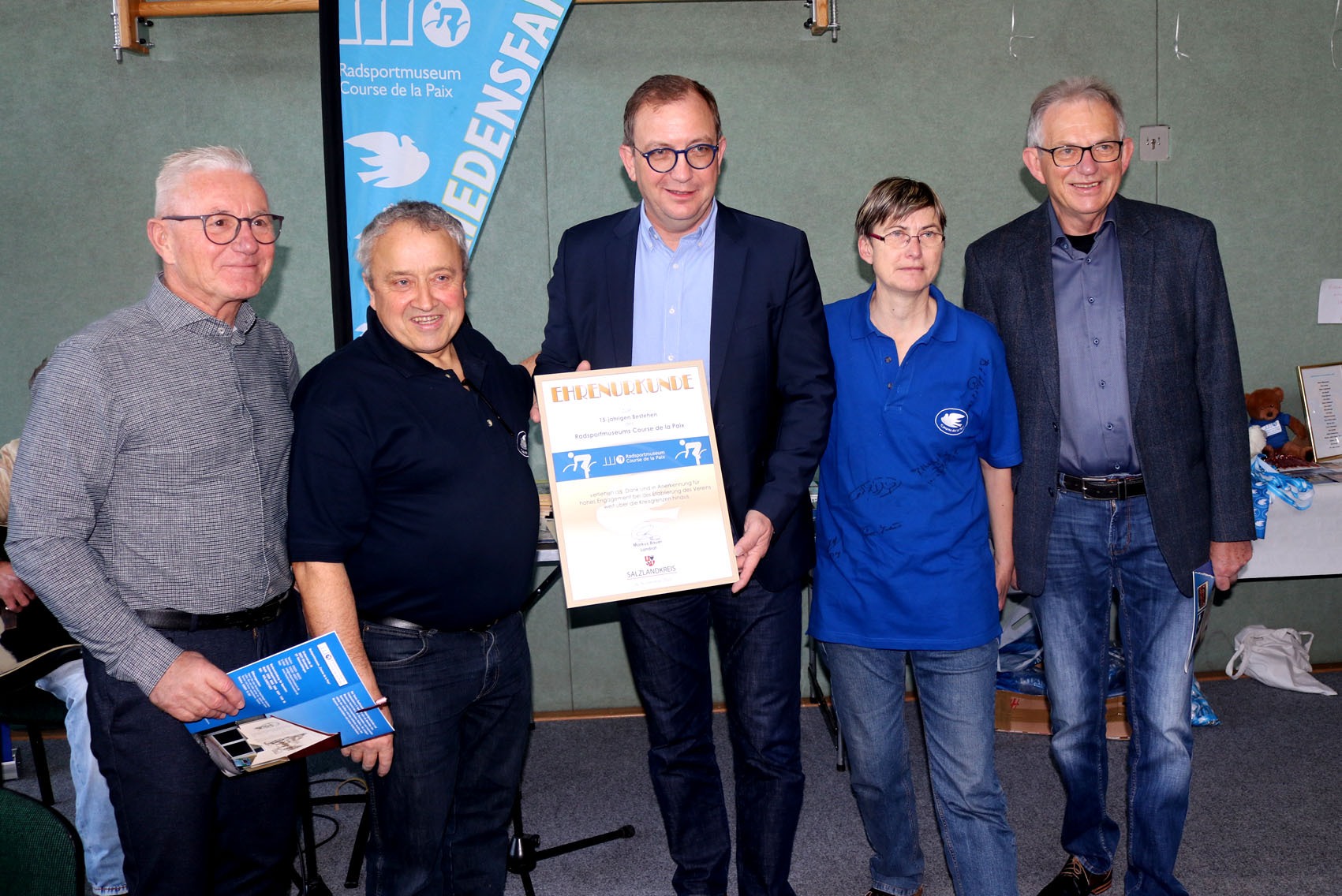 Es ging hoch her am Samstag den 26.November 2022 im Sportzentrum in Kleinmühlingen, denn das Radsportmuseum „Cours de la Paix“ hatte anlässlich des  fünfzehnjährjgen  Bestehens zu einer Geburtstagsparty geladen. Schäfer hatte eingeladen und alle kamen. Rund 200 Gäste aus nah und fern ließen es sich nicht nehmen, mit Blumen und Geschenken, dem Museum seine Referenz zu erweisen. Im Mittelpunkt dieser Veranstaltung standen aber diesmal nicht die ehemaligen „Giganten der Landstraßen,“ sondern durch den Leiter des Museums Horts Schäfer, wurden mit herzlichen Worten,  die Bauleute und freiwilligen Helfer geehrt, die durch ihre fleißige Arbeit vor 15 Jahren zum Entstehen dieses Hauses beigetragen haben. Auch die vielen Unterstützer ,die durch Spenden beigetragen haben, dass der Traum vom Museum Realität geworden ist, wurden mit herzlichen Worten bedacht. Sie alle standen am Sonnabend im Mittelpunkt. Zahlreiche Persönlichkeiten aus Politik und Wirtschaft, Abordnungen aus der Welt des Radsportes und wahre Freunde des Museums, gratulierten dem Museumsverein und wünschten für die Zukunft immer ein volles Haus und noch viele Besucher. Natürlich war auch der Altmeister der Pedalen, Gustav -Adolf (Täve) Schur mit von der Partie und auch Tarek Aboul Zahab aus Beirut (Libanon) war angereist um diesen Tag zu feiern. Musikalisch umrahmt wurde die Geburtstagsfeier durch das Saxophon-Duo Rainer Schulz aus Schönebeck und die Versorgung der vielen Gäste lag wie immer in den Händen der Familie Katte aus Kleinmühlingen. Ein abwechslungsreiches Programm wurde durch den Moderator des Museums, Jürgen A. Schulz geleitet und im Anschluss an die Feier ,besuchten die Gäste in großer Zahl auch noch das Radsportmuseum. Aber, nach dem Spiel, ist vor dem Spiel und Horst Schäfer und seine Truppe macht sich schon wieder Gedanken, wie sie den Himmelsfahrttag 2023 gestalten werden, denn dann stehen die ehemaligen Friedensfahrer im Mittelpunkt der Veranstaltung „75 Jahre Internationale Friedensfahrt“