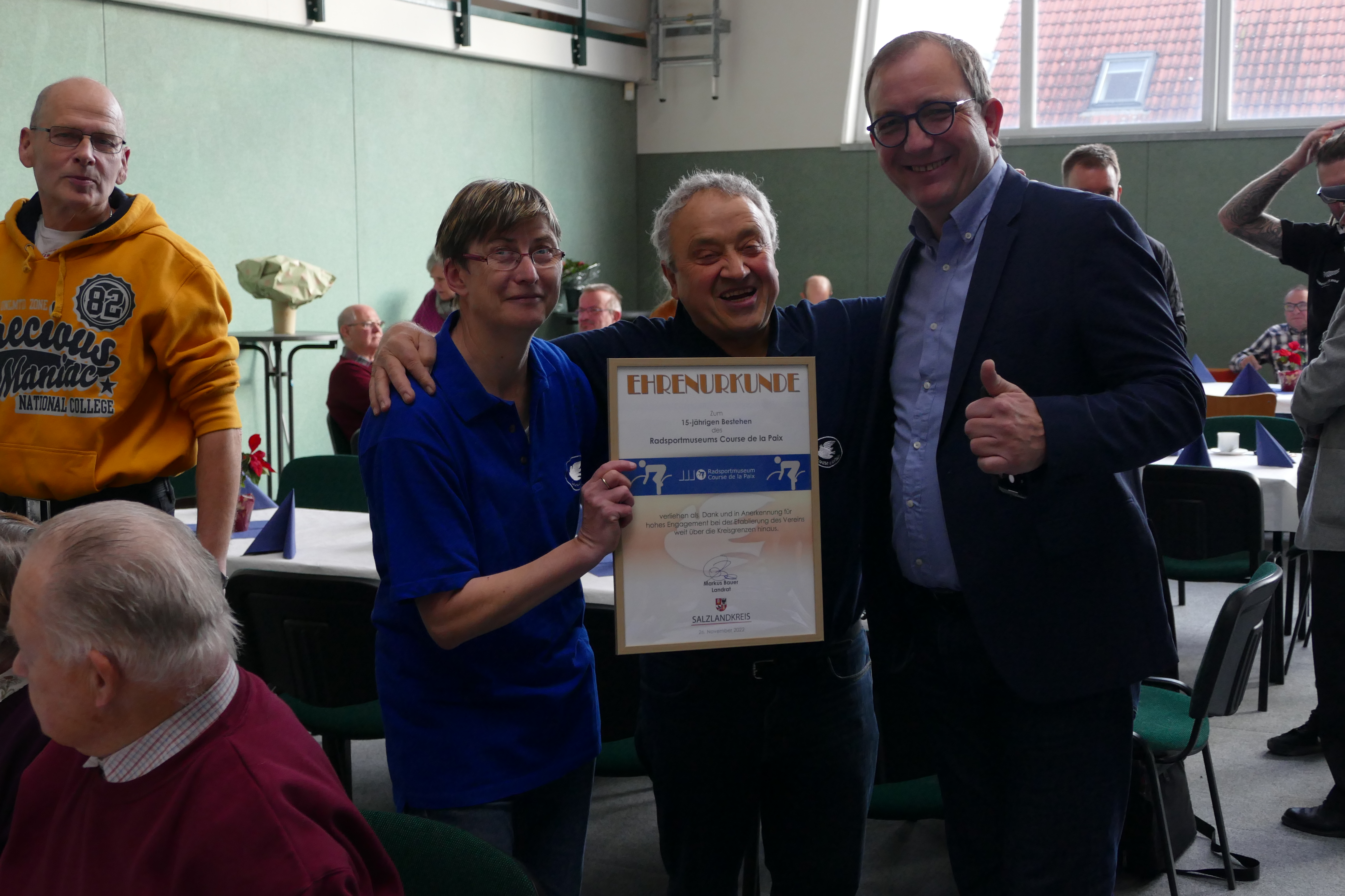 Es ging hoch her am Samstag den 26.November 2022 im Sportzentrum in Kleinmühlingen, denn das Radsportmuseum „Cours de la Paix“ hatte anlässlich des  fünfzehnjährjgen  Bestehens zu einer Geburtstagsparty geladen. Schäfer hatte eingeladen und alle kamen. Rund 200 Gäste aus nah und fern ließen es sich nicht nehmen, mit Blumen und Geschenken, dem Museum seine Referenz zu erweisen. Im Mittelpunkt dieser Veranstaltung standen aber diesmal nicht die ehemaligen „Giganten der Landstraßen,“ sondern durch den Leiter des Museums Horts Schäfer, wurden mit herzlichen Worten,  die Bauleute und freiwilligen Helfer geehrt, die durch ihre fleißige Arbeit vor 15 Jahren zum Entstehen dieses Hauses beigetragen haben. Auch die vielen Unterstützer ,die durch Spenden beigetragen haben, dass der Traum vom Museum Realität geworden ist, wurden mit herzlichen Worten bedacht. Sie alle standen am Sonnabend im Mittelpunkt. Zahlreiche Persönlichkeiten aus Politik und Wirtschaft, Abordnungen aus der Welt des Radsportes und wahre Freunde des Museums, gratulierten dem Museumsverein und wünschten für die Zukunft immer ein volles Haus und noch viele Besucher. Natürlich war auch der Altmeister der Pedalen, Gustav -Adolf (Täve) Schur mit von der Partie und auch Tarek Aboul Zahab aus Beirut (Libanon) war angereist um diesen Tag zu feiern. Musikalisch umrahmt wurde die Geburtstagsfeier durch das Saxophon-Duo Rainer Schulz aus Schönebeck und die Versorgung der vielen Gäste lag wie immer in den Händen der Familie Katte aus Kleinmühlingen. Ein abwechslungsreiches Programm wurde durch den Moderator des Museums, Jürgen A. Schulz geleitet und im Anschluss an die Feier ,besuchten die Gäste in großer Zahl auch noch das Radsportmuseum. Aber, nach dem Spiel, ist vor dem Spiel und Horst Schäfer und seine Truppe macht sich schon wieder Gedanken, wie sie den Himmelsfahrttag 2023 gestalten werden, denn dann stehen die ehemaligen Friedensfahrer im Mittelpunkt der Veranstaltung „75 Jahre Internationale Friedensfahrt“